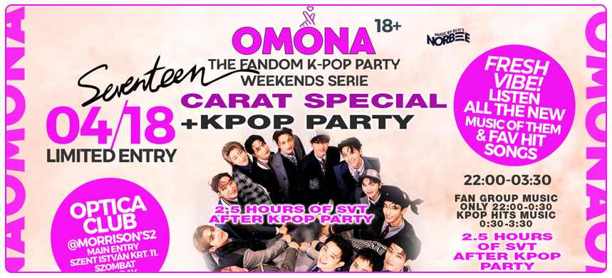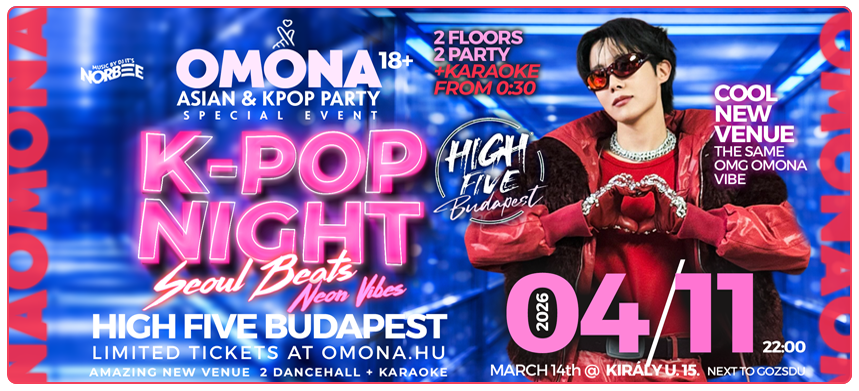 Hogy mi az az OMONA? Koreaiul annyit tesz, hogy OMG (OhMyGosh). És hogy miért így hívják Budapest legWOW-abb K-POP party sorozatát? Mert szimplán ennél jobb szót nem fogsz találni az egyik legjobb buli élményedre nálunk. 2016 augusztsában indult útjára az OMONA, ami mára kinőtte magát Budapest legKülönlegessebb, legFantasztikusabb, legCsaládiasabb de legNagyobb és legEgyedibb Koreai buli sorozatává. Minden bulin fantasztikus hangulattal, a legjobb koreai zenékkel, meglepetésekkel, ajándékokkal, nyereményekkel (úgy, mint máshol sehol) vár téged az OMONA, nem is beszélve a remek italakciókról, a barátságos társaságról, szervező csapatról na és persze a legCOOLabb magyar és ázsiai arcokról.
